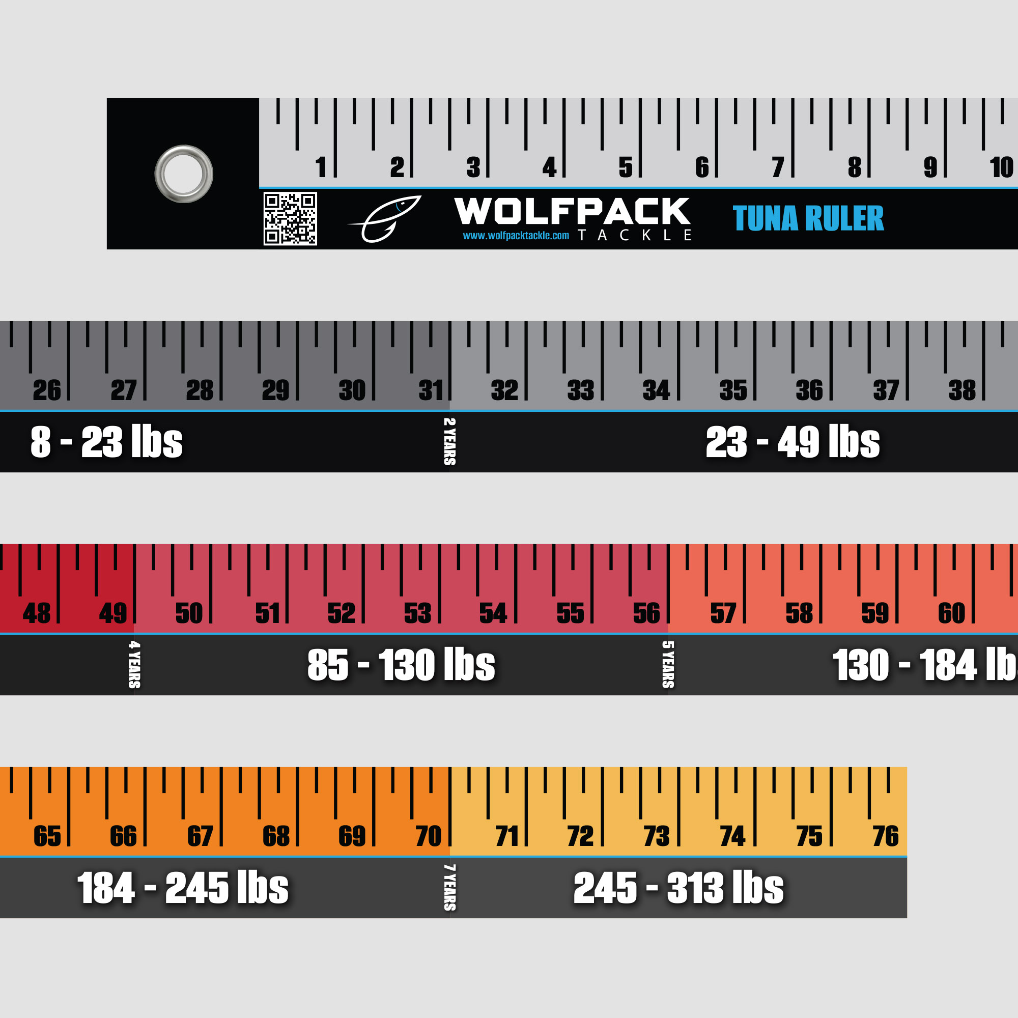 WolfPack Tackle Custom vinyl fish rulers come in 76″ and 144″ variations, perfect for measuring game of all sizes. With the included metal grommet, the ruler is easy to connect to a gaff and lay in the water for measuring bill fish!